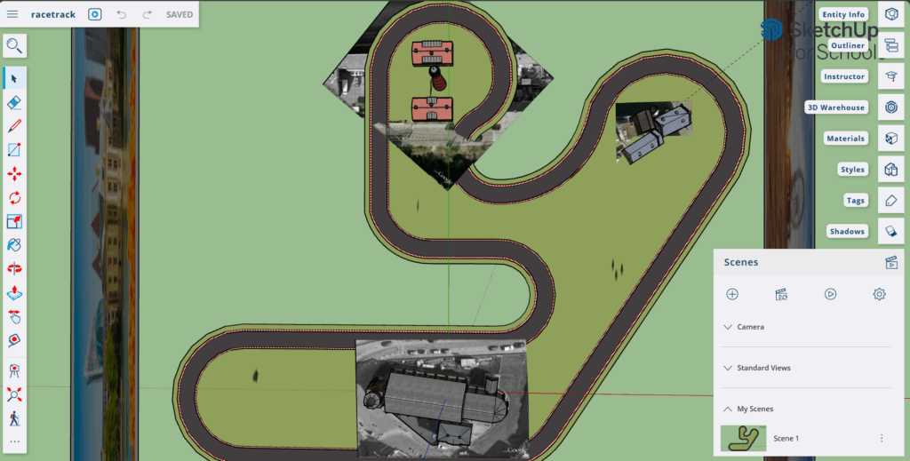 ik heb een racetrack gemaakt met het 3D programma Sketch-Up, het onderwerp gaat over mijn stad den haag en scheveningen. ik heb via het zoeken in het programma naar de afbeeldingen, gebouwen en bomen om het meer tot even laten brengen, ik heb ook de plaatsjes aan de zijkant van de track van google/google maps gepakt met het screenshotten of opslaan van de afbeeldingen.